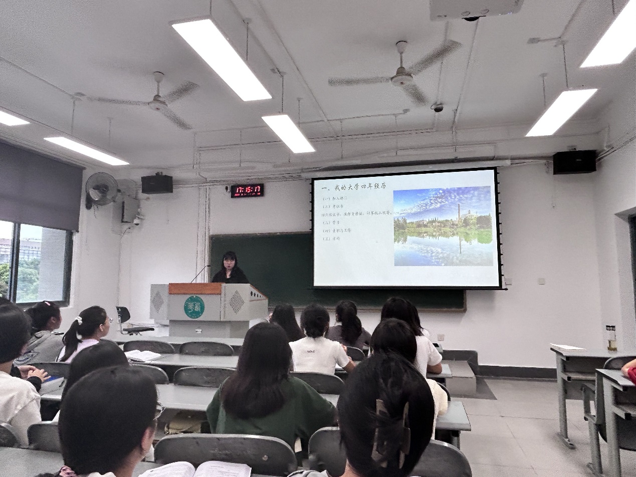 分享会还特别邀请了优秀研究生代表马小琴为同学们进行了经验交流分享。她围绕大学生如何度过大学四 年以及未来的职业选择方向展开了细致的讲解。她鼓励同学们以时不我待,只争朝夕的精神面貌度过大学时光,坚持凡事预则立的标准应对新挑战。坚持远大理想与脚踏实地相结合,不随波逐流,遵从内心。她勉励同学们不怕困难,勇于挑战,持之以恒。
