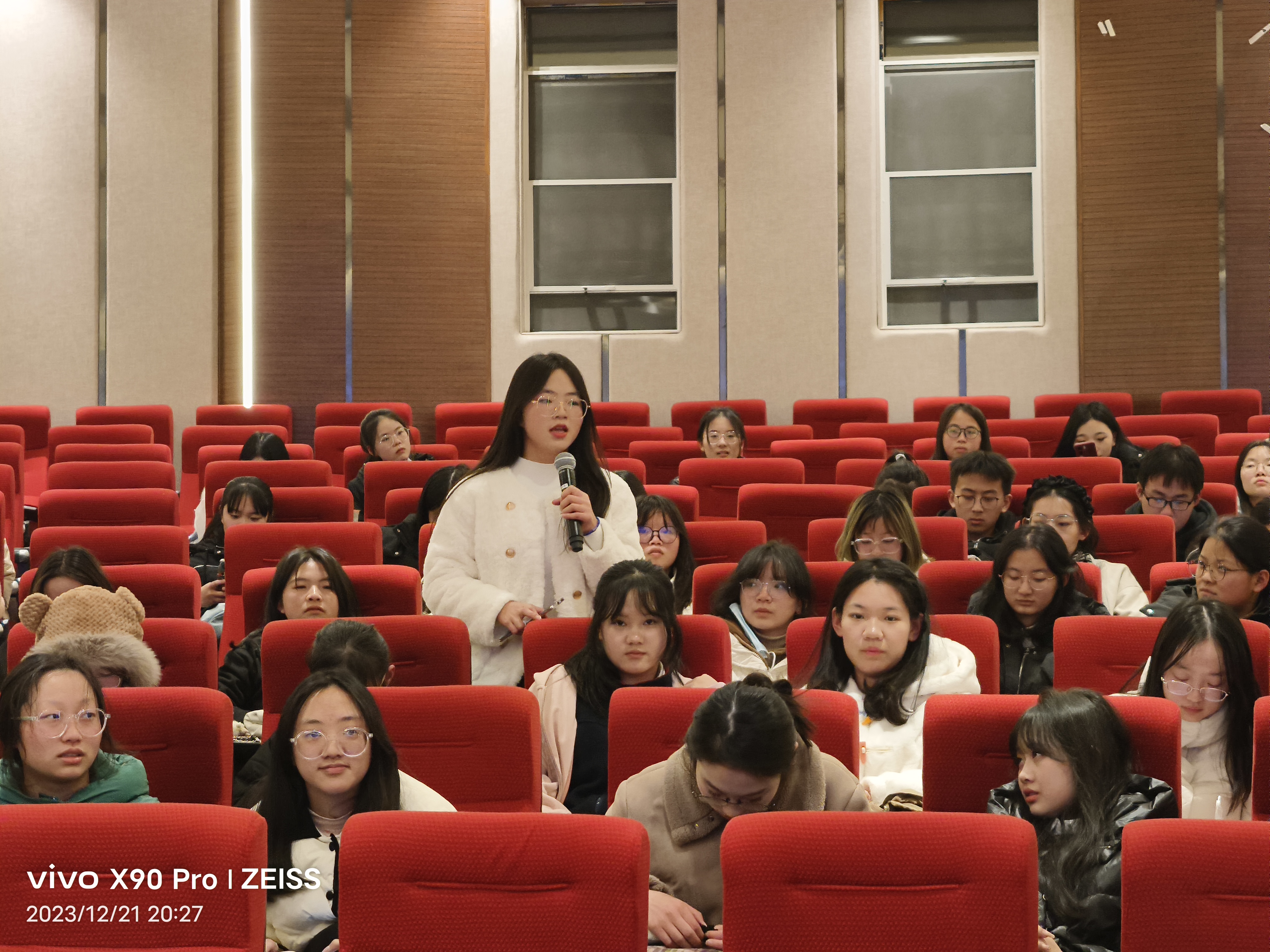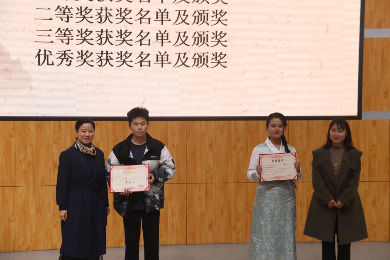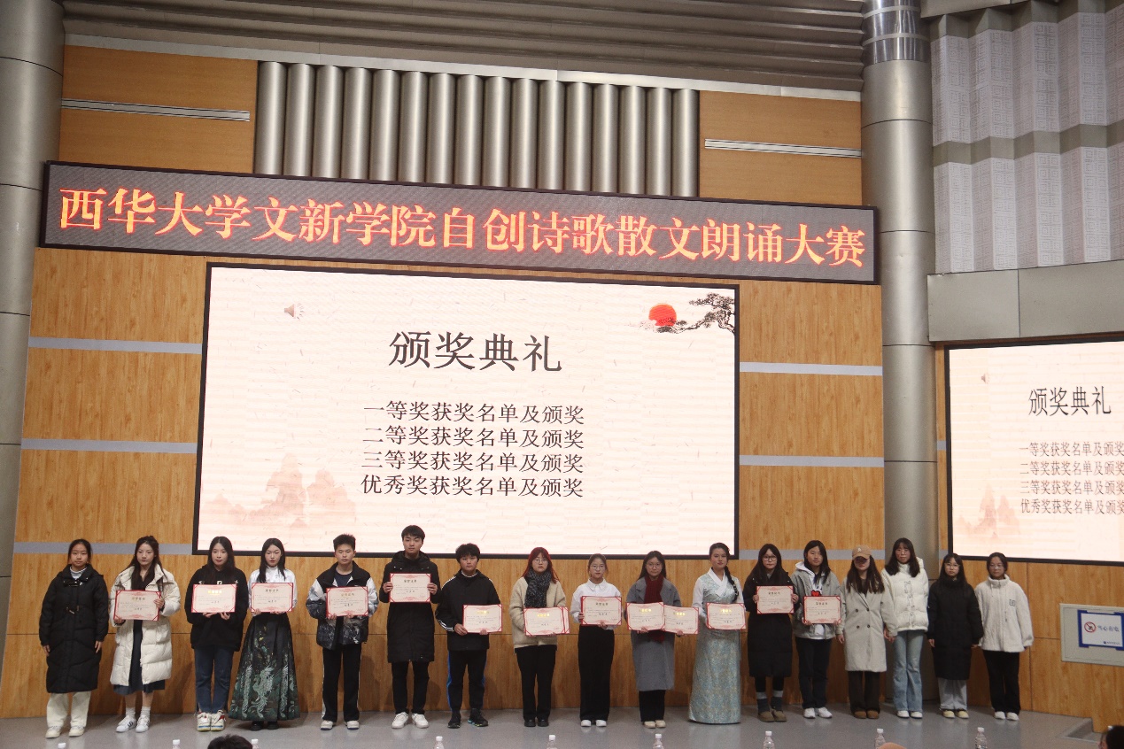 2023年12月21日下午6点,西华大学国家级线上线下混合式一流课程“写作”第四届自创诗歌散文朗诵大赛在四教报告厅完满落幕,西华大学教务处副处长刘雪梅老师、苹果树下培训学校校长伍苹老师、西华大学人事处教师工作部李红梅博士,文新学院院长潘殊闲教授、副书记徐攀老师、副院长王学东教授、副院长范佳博士、中文系主任王燕飞博士、中文系副主任蒋林欣博士等担任比赛评委。文新学院2023级辅导员陈柄志老师、任焦阳老师、毛雪花老师和2023级写作教师李晓华教授、王万洪教授、王国巍老师全程指导,现当代文学专业研一学生叶星怡、陈星羽、刘明霞、黄璐作为“写作”课程助教也全程联动。汉文一班何蓉、汉文二班陈思霏、汉语国际教育1班陈柳彤担任学生评委。