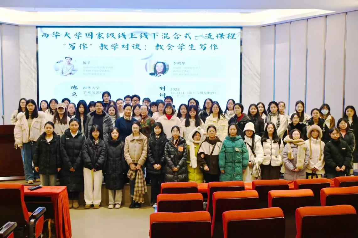晚上七点,西华大学教授李晓华和苹果树下创始人伍萍校长在西华大学学术交流中心进行了“梦幻联动”——对谈“如何教会学生写作”。