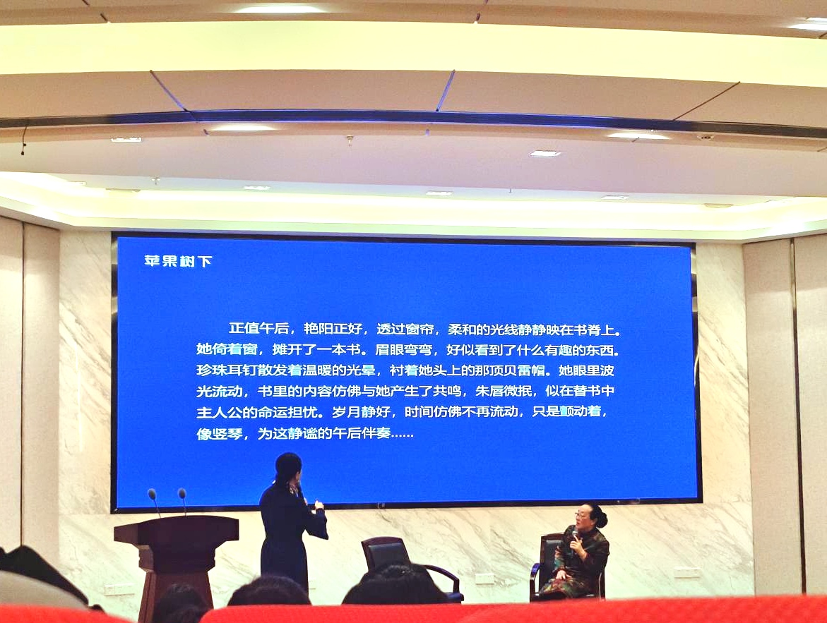 苹果树下培训学校创始人伍苹校长代表评委进行大赛点评。她表示同学们以朗诵的形式使文字变得生动形象了起来,肯定了参赛选手们的写作与朗诵能力。她与全体同学分享自己在鲁院的学习经历,就“写作”这项工作,提炼了四句话——阅读是根基;思想是核心;创新是亮点;语言是原点。就朗诵舞台展示方面,伍苹校长从着装、仪态、站位等等细节处为同学们提供了十分切实的改善建议。这位从“苹果树下”走进西华校园的和蔼校长不仅走进了同学们的视野中,也走进了同学们的心里,大家对晚上的作家“教会学生如何写作”的圆桌对谈升起了更强烈的期待。据悉,今后西华大学文新学院与苹果树下将在写作教学和整本书阅读研究领域有更多专业交流与合作。