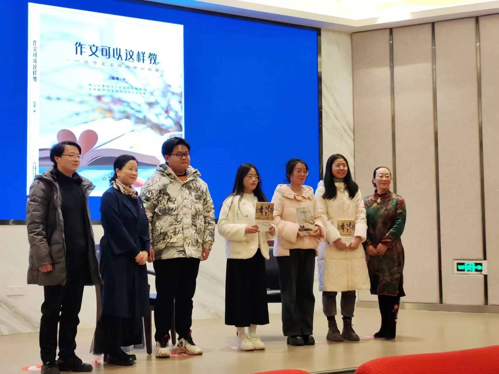 另外,伍苹校长还分享了自己戴着贝雷帽,坐在教室看书,当学生写作的“模特”,让学生用文字来描绘这个场面的有趣经历。大屏幕上,只见一位学生描写到:“正值午后,艳阳正好,透过窗帘,柔和的光线静静映在书脊上。她倚着窗,摊开了一本书。眉眼弯弯,好似看到了什么有趣的东西,珍珠耳钉散发着温暖的光晕,衬着她头上的那顶贝雷帽。她眼里波光流动,书记的内容仿佛与她产生了共鸣,朱唇微抿,似在替书中主人公的命运担忧……”跟随小作者的文字,大家的脑海中似浮现出了相应的画面,纷纷为作者优秀的文笔和细腻的语言鼓掌。