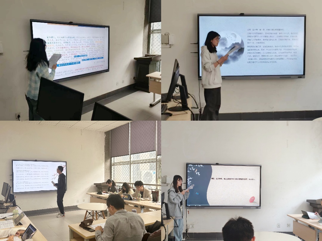 活动伊始,余茹兰、张子豪、程洁、邹妮轩四位汇报人依次上台,就自己所撰写的清代悼亡诗研究论文进行汇报,并按抽签顺序进行交叉评议。评议人指出:四篇论文对材料的引用认真详备,论文的结构和思路清楚,但在撰写过程中还存在标点不规范,中英文标点混杂;部分段落语言不畅,逻辑仍需考量;对研究对象著作全篇引用,似有累赘之嫌等问题。王燕飞老师进一步指出论文摘要对研究对象的描述应该简单明了,摘要重点应放在悼亡诗的艺术特色上;对于悼亡诗内容的概括应当由浅入深,循序渐进;对于研究对象简述事实即可,不必做主观的评价等问题。随后,与会的其他同学围绕四篇悼亡诗论文进行热烈地讨论,提出了诸如对于悼亡诗的分析不应停留在文本细读,而要将其放置在文学史和文学批评理论中进行探讨等诸多问题和修改意见。王燕飞老师对上述意见逐一进行点评,会场气氛热烈。会后,四位汇报人将结合大家指出的不足进行进一步修改。