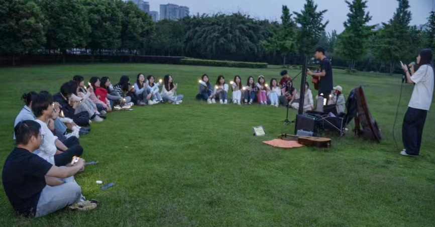 宣传部与记者团的成员们齐聚在草坪,共同参加了丰富多彩的团建项目。首先进行的是草坪音乐会,成员们在轻松愉悦的环境中享受音乐带来的快乐,共享美好时光,进一步拉近了彼此之间的距离。