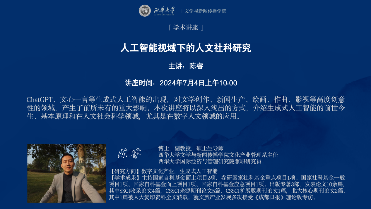 2024年7月4日上午10点,伟德国际1946,Bevictor伟德,伟德官网在6A127举办题为“从《文心雕龙》到‘文心一言’——人工智能视阈下的人文社科研究”的学术讲座,讲座同步开启线上分享。文新学院文产系主任陈睿副教授担任主讲人,中文系教师邹波副教授担任主持,文新学院、学校图书馆、学校学术期刊编辑部等老师以及中国语言文学专业研究生、本科生代表共计70余人参加。