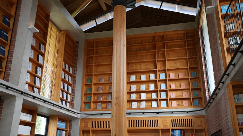 随后,成员们的脚步来到乡村书局——香觉图书馆,其内部为典型的大树型结构。四周的景色与书中的世界相互交融,书架上的各类书籍摆放整齐,采光通透,整体给人一种赏心悦目之感。成员们安静地站在窗边翻阅书籍,透过玻璃可以看到窗外的乡村景色,美不胜收。合上书本,成员们对书籍进行整理后离开。