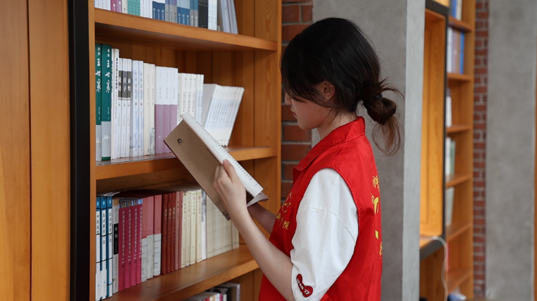 实践团成员在书柜前阅览图书 中国青年网通讯员林紫阳供图