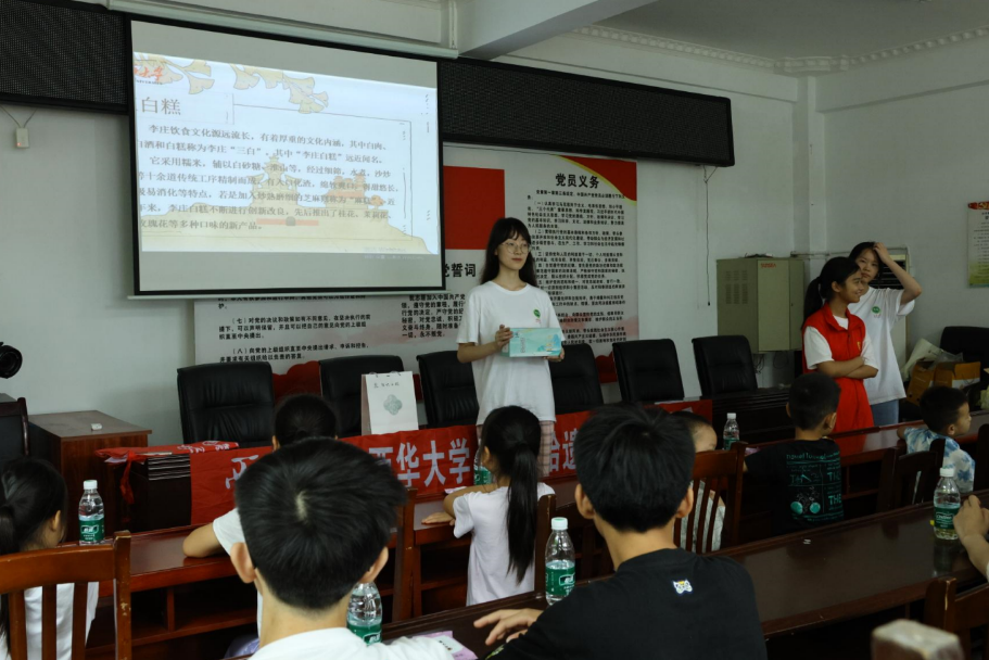 实践团成员何翌宁向小朋友们介绍了多种宜宾市非物质文化遗产,并向小朋友们引入了文化传承的重要意义。又由庞文晨曦进行了李庄白糕的具体介绍,并邀请小朋友们进行品尝。