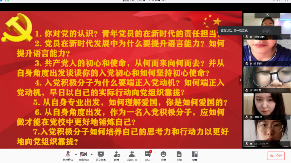 为更加规范、高效地推进线上党校工作,学院采取“7+2+2“的模式进行管理,将学员分成7个小组,每周要求撰写2份周报,学员撰写学习周报记录学习成果感想,组长撰写组长周报记录工作心得;学院党校干部组织策划2场专题研讨会,以“心有党魂,行有党性”和“万众一心战疫情”为主题,每个主题下特设7个小选题,面对对党的认识和党与自己的关系等问题,各小组结合历史,跟紧时代,从个人专业、个人角度出发发表意见。
