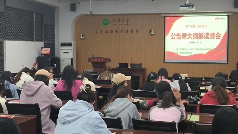 2025年度国家公务员考试公告已经发布,为帮助同学们在报考过程中科学选岗、高效备考,10月21日,西华文新——“青蓝”职业发展与就业咨询工作室组织了一场公务员考试政策解读及备考指导讲座,特邀请中公教育专家老师,为同学们进行岗位筛选与填报指导、考试大纲梳理、高频考点分析,以提高同学们备考效率。学院55名同学参加了讲座。