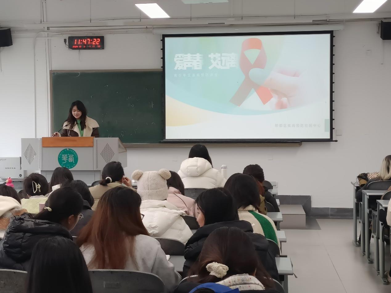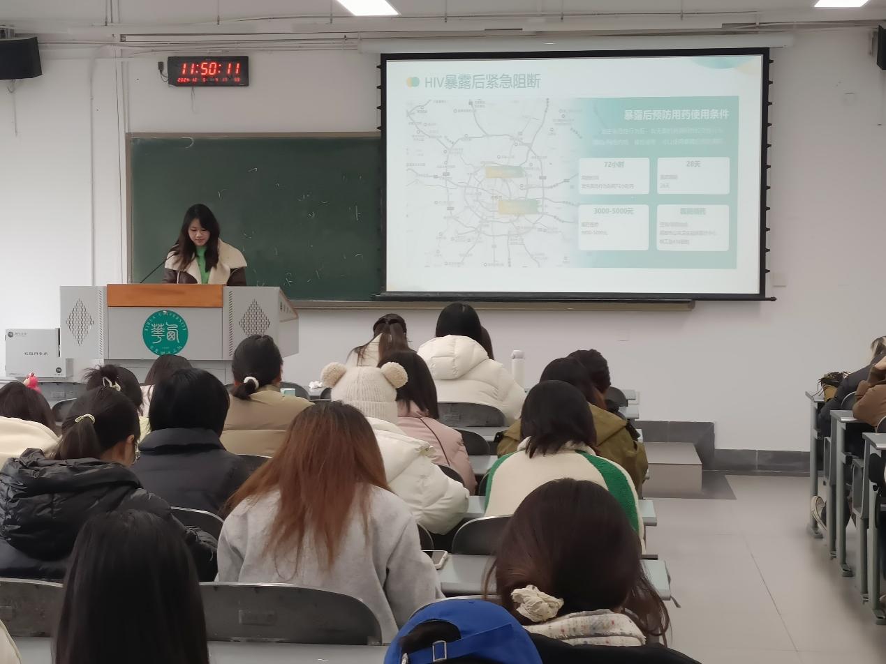 活动开始前,两个班的班长先对到来的全体同学进行了考勤,确保人数到齐后正式开展活动。活动开始,由汉语言文学三班班长李欣露带领大家进入到本次班会活动的主题:艾青春,艾远离。具体为大家讲解了什么是艾滋病以及关于艾滋病的传播途径和危害。接着李欣露又为大家介绍了预防艾滋病的方法,同学们专注倾听