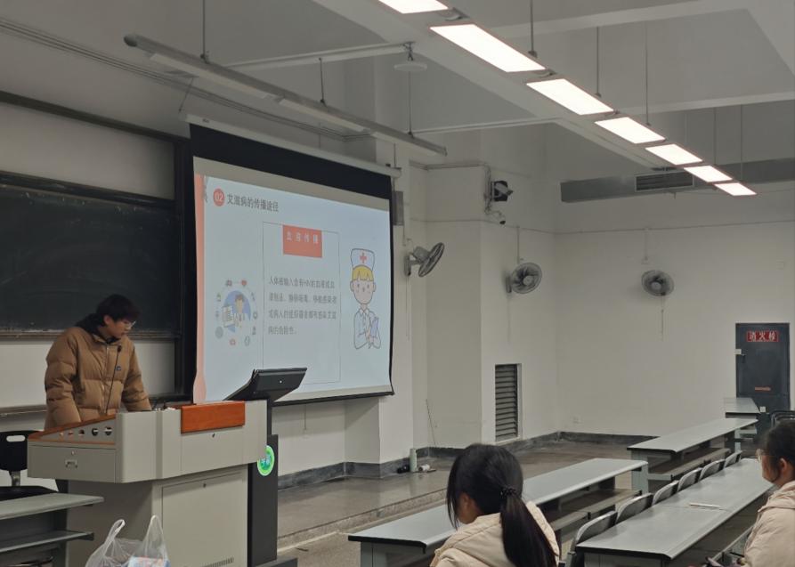 宣讲会伊始,主讲人欧阳维卓通过生动的图片、详实的数据向同学们系统地介绍了艾滋病的致病原理、传播途径、临床表现和预防措施。此外,他还特别强调了艾滋病的传播途径主要包括血液传播、性传播和母婴传播,消除了大家对日常接触如握手、共用餐具等会感染艾滋病的误解。