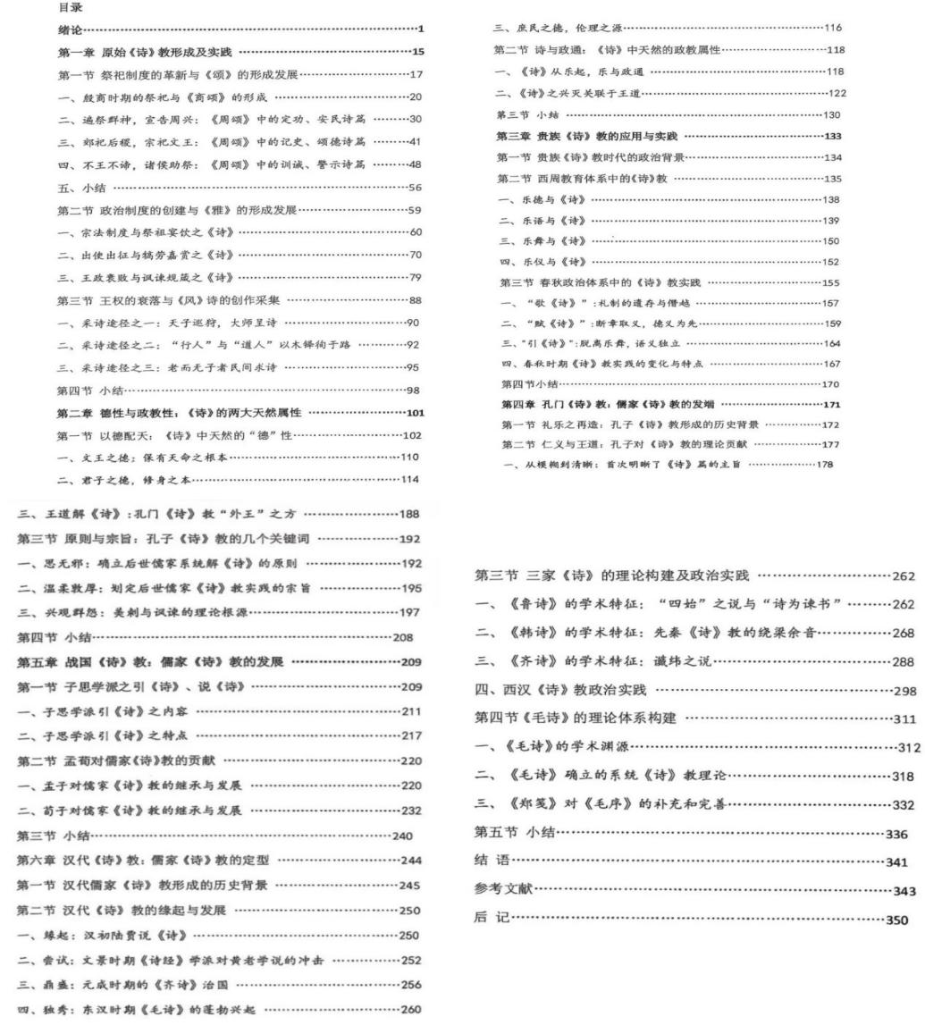 该书分为六个章节,主要研究传统《诗》教在形成和发展历程中的理论构建、文化传播和经世实践,探索传统《诗》教如何在古代政治需求与儒者理想之间构建新的话语模式,尝试以全新视角审视传统《诗》教的价值和意义。通过对《诗经》的文化渊源、政治功能及其与社会变革的互动关系进行系统梳理,揭示了《诗》教从原始形态到儒家经典教化形态的演变脉络及其各阶段特点,阐明了《诗》教发展的内在逻辑,分析了《诗》教每一阶段发展变化背后的政治及社会原因。除对《诗》教理论发展的研究外,该书尤其注重《诗》教在实际政治、教育和社会生活中的应用,探讨其在不同历史时期的实践方式和实践效果。