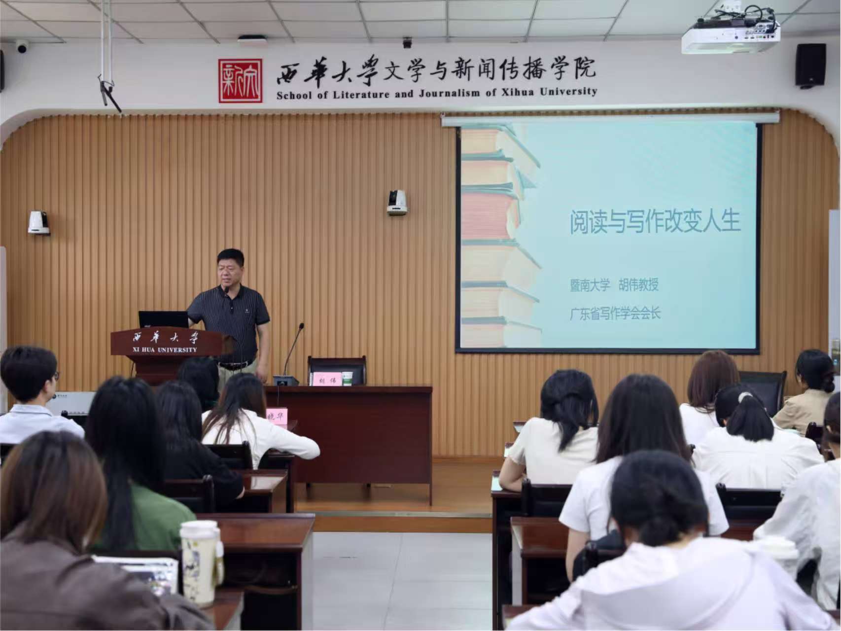 4月24日下午,广东省写作学会会长、暨南大学教授胡伟应学院邀请莅临“蜀学百家讲坛”,在郫都校区6A-127会议室开展了题为“阅读与写作改变人生”的学术讲座。学院副院长王学东教授、中文系教师李晓华教授出席本次讲座,各年级研究生、本科生代表参加讲座。讲座由李晓华教授主持。