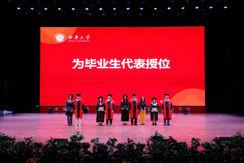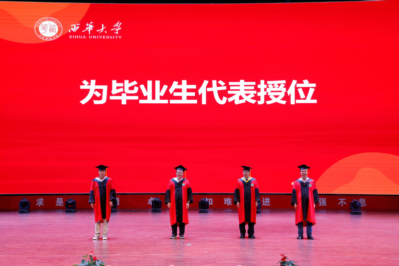 学院学位评定分委员会委员主席、院长潘殊闲宣读学位授予决定。西华大学副校长邵永波,学院院长潘殊闲、文产系主任陈睿、传媒副主任黄任勇为获得学位的毕业生们进行授位拨穗正冠仪式。这一刻,是他们学术生涯的重要里程碑,更是他们成长历程中的高光时刻。
