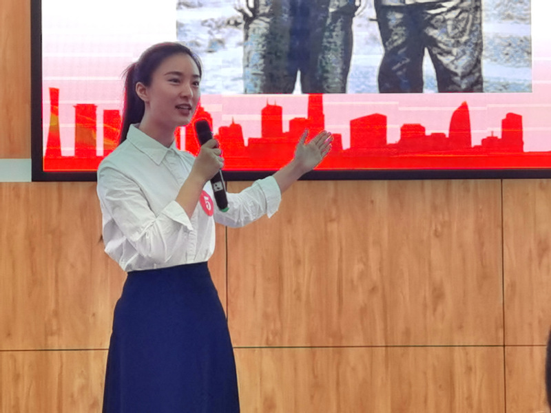 伴随着恢弘的音乐,丁秦围绕中国革命领袖代表周恩来同志的生平、功绩及理想信念等方面展开了题为一代伟人周恩来的演讲,她平缓、沉稳而富有感情的讲述感染了在场的评委与观众,最终以综合得分最高分的成绩获得了本次“四史”讲述大赛的一等奖