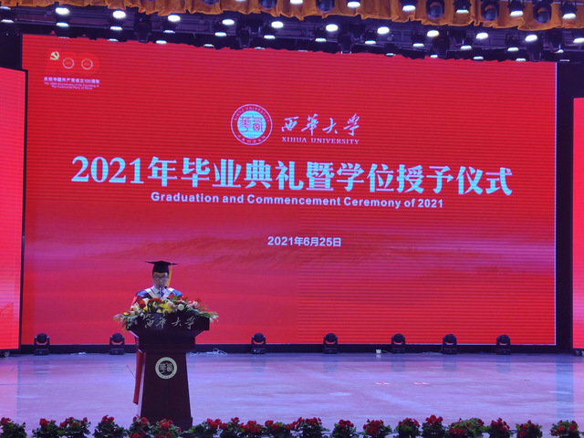 2021届汉语国际教育专业范旋同学作为毕业生代表发言,向辛勤付出的领导和老师们表示了最衷心的感谢和最崇高的敬意。范旋说,自己对大学四年的时光有着深深的不舍,但仍要继续向前,追寻新的梦想。她表示无论以后身在何方、位居何职,都会牢记“己欲立而立人,己欲达而达人”的深刻道理,将“求是、明德、卓越”的校训铭记在心。
