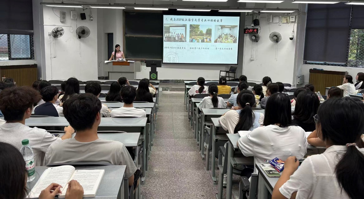 9月15日下午,伟德国际19462025级汉语言文学专业在6B101教室举行新生分享会,邀请2021级优秀校友邱母阿散莫为新生分享大学规划与学习经验,辅导员任焦阳及全体新生参会。