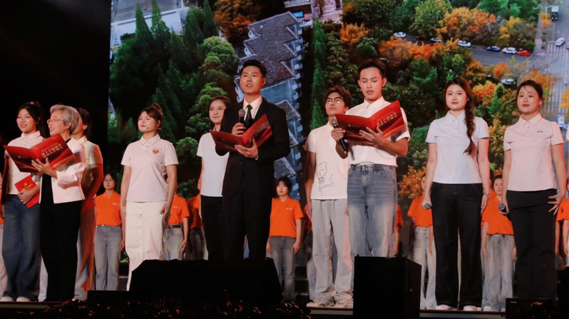 晚会现场流光溢彩,气氛热烈。在领诵老师沉稳而富有感染力的引导下,朗诵团队以饱满的热情、铿锵的语调和默契的配合,声情并茂地演绎了一段用热血写就的铮铮誓言,从杨诚院长“天下无难事”的坚定信念,到杜同先生“为人民服务”的忠贞不渝;从王华明教授“为国奋斗”的炽热情怀,到徐博海校友“坚守岗位”的无悔赤诚,娓娓道来,感人至深。整场朗诵将西华大学深厚的文化底蕴与师生校友赤子报国的豪情壮志紧密融合,展现了西华学子肩负时代使命、勇毅前行的坚定信念。最终,这场精彩的演绎赢得了全场观众热烈的欢呼与掌声。