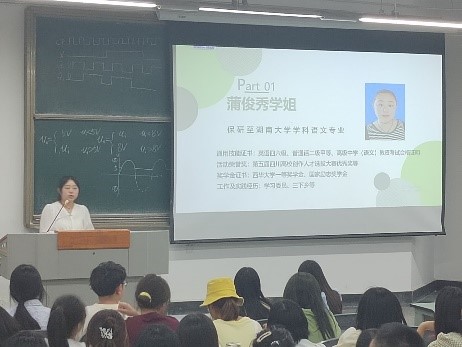 第一位分享的是蒲俊秀学姐,她主要以学习的方面向我们分享了她的大学经历。第一是要做好课前预习、上课的笔记以及课后整理,这样做让我们在上课时不会那么迷茫,课后的整理更是让自己重新构建课堂的方式,巩固所学,课堂上要主动争取展示自己的机会;对于学习,可以制定相关计划表,课外不局限于课表,可利用互联网资源搜索相关知识学习来拓展自我。第二是要养成背诵和深入思考的习惯,背诵是我们中文专业学习的基本要求,深入的思考能加深我们对知识的理解。第三是在努力学习的同时要注意劳逸结合,在放松自己。