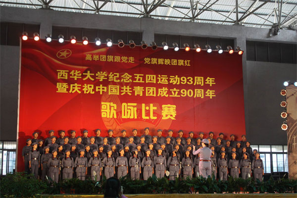 5月4日下午14:00,西华大学纪念“五四”运动93周年暨庆祝中国共青团成立90周年歌咏比赛在学校体育馆隆重举行。经过激烈角逐,人文学院学生合唱团在全校20余支参赛队伍中脱颖而出,用昂扬向上的精神风貌以及嘹亮动听的歌声赢得评委和在场观众的好评,最终夺得比赛一等奖。