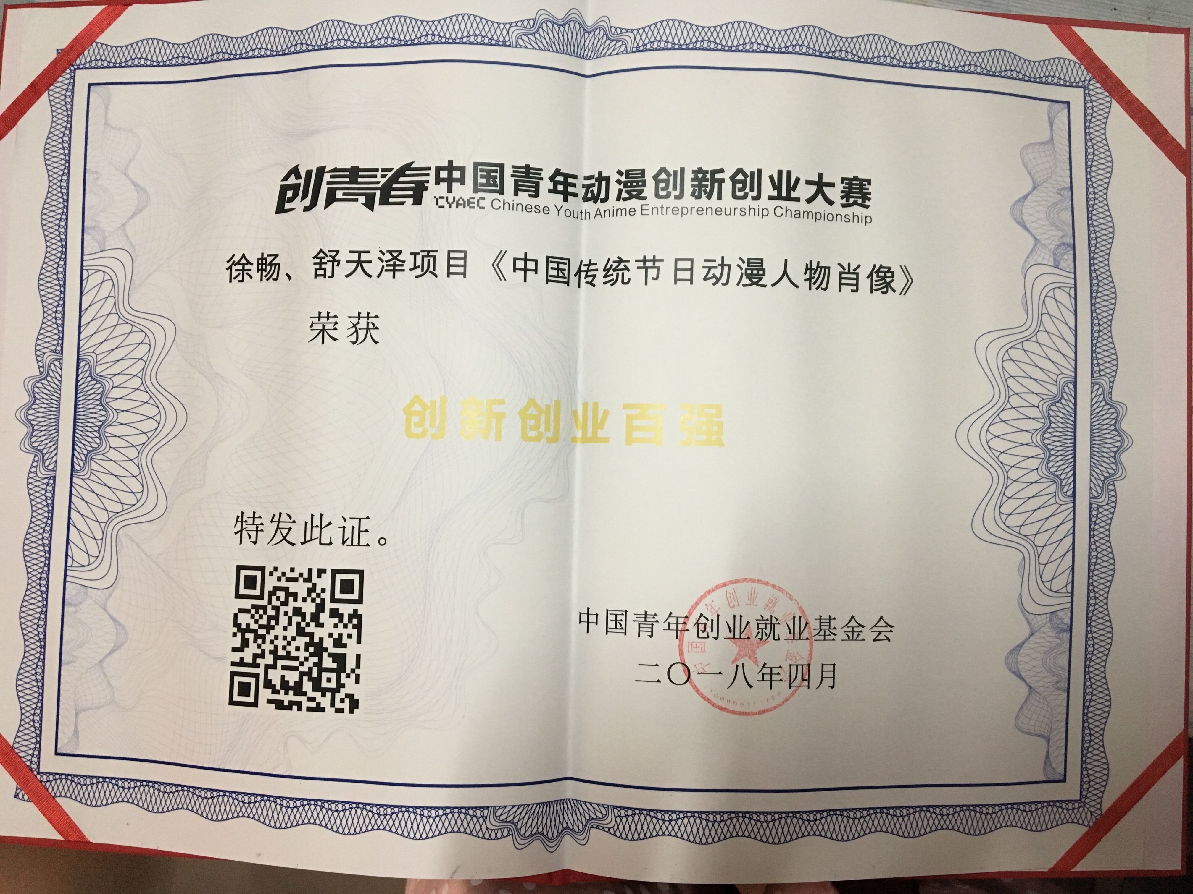 经过评委综合评选,《中国传统节日动漫人物肖像》获得创新创业百强荣誉。