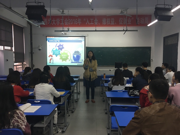 在西华大学工会2016年“入工会、维权益、促就业”活动周,学院分党委副书记、副院长张雪征于10月18日为全院部分师生就工会组织在职工维权中的作用、学生就业政策、就业材料准备和面试技巧等内容进行了专题讲座。学院师生100余人参加了讲座。