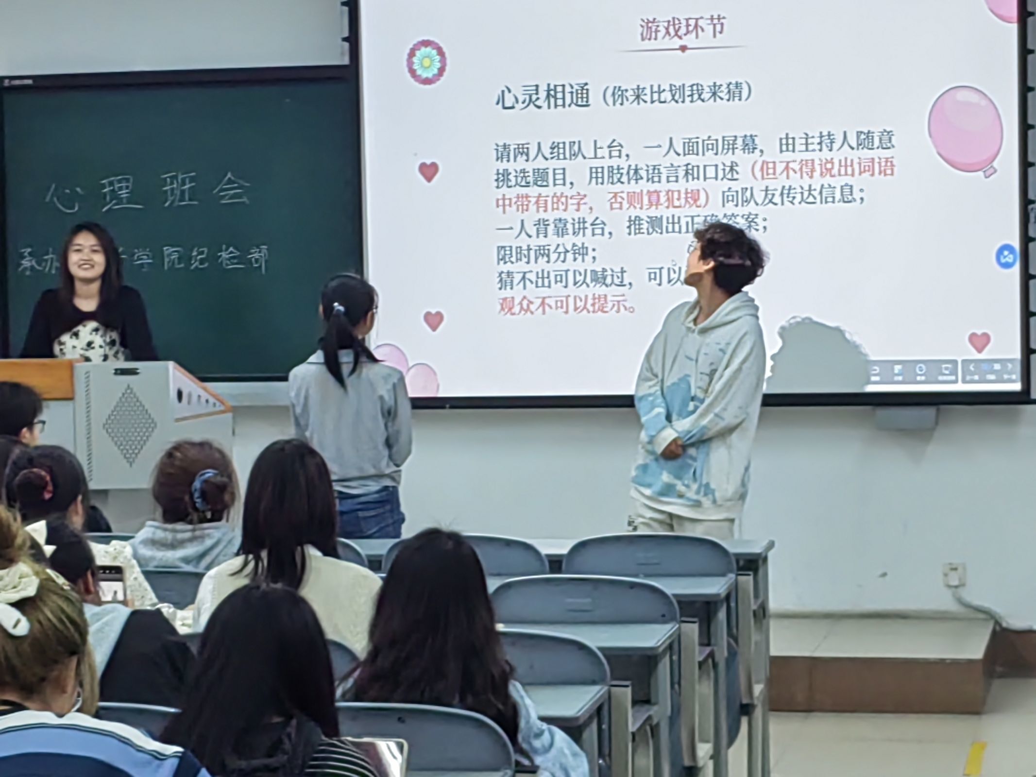 此次班会宣讲内容主要针对大部分在大学生群体中有关身材焦虑、校园暴力、恋爱心理等常见的问题,通过以PPT解说、播放视频以及组织同学们积极有序地参加趣味小测试和游戏互动等方式,让同学们能够更加生动、深刻的学习掌握到有关心理健康知识。在心理测试环节,同学们认真参与小测试,了解自己的心理状况。班会还设置了游戏环节“你比我猜”,同学们积极参与游戏,提升了同学们的参与感。