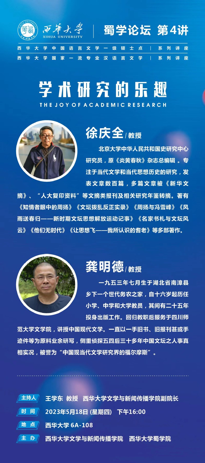 龚明德教授,一九五三年七月生于湖北省南漳县乡下一个世代务农之家,自十六岁起历任小学、中学和大学教员,其间有二十五年投身出版工作。回归教职后服务于四川师范大学文学院,讲授中国现代文学。一直以一手旧书、旧报刊甚或手迹件等为原料业余研写,侧重侦探五四后三十多年中国文坛之人事真相实况,被誉为“中国现当代文学研究界的福尔摩斯”。