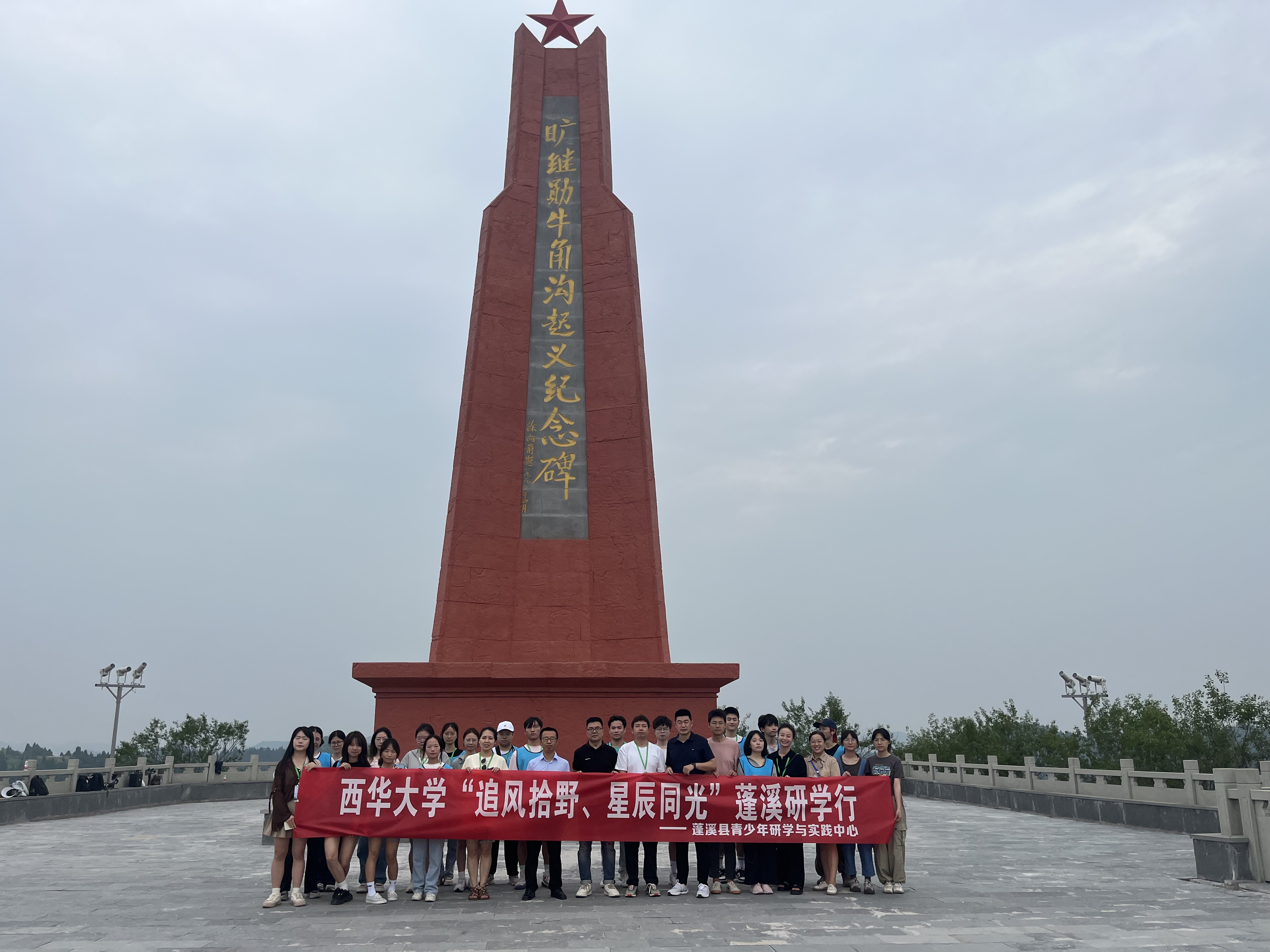 图为西华大学师生在旷继勋牛角沟起义纪念碑下合影